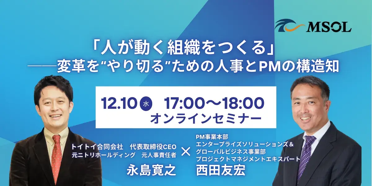 戦略はある。計画もある。──それでも、現場が動かない。 多くの企業が直面するこの課題の本質は、「やり方」や「ツール」ではなく、“人と組織が、どう動くか”という構造にあります。 本セミナーでは、人事の知恵 × プロジェクトマネジメントの実務という二つの知を掛け合わせ、“個が主体的に動き、組織が揃って進む”状態を、どう実装するかを紐解きます。